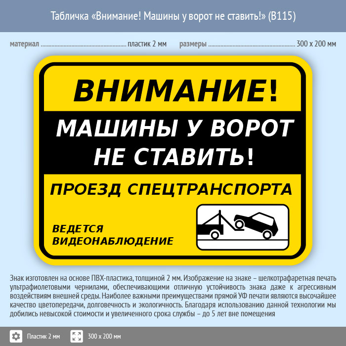 Табличка «Внимание! Машины у ворот не ставить!», B115 (пластик, 300х200 мм) в Курске купить