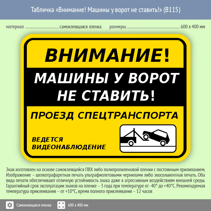 Табличка «Внимание! Машины у ворот не ставить!», B115 (пленка, 600х400 мм) в Курске купить
