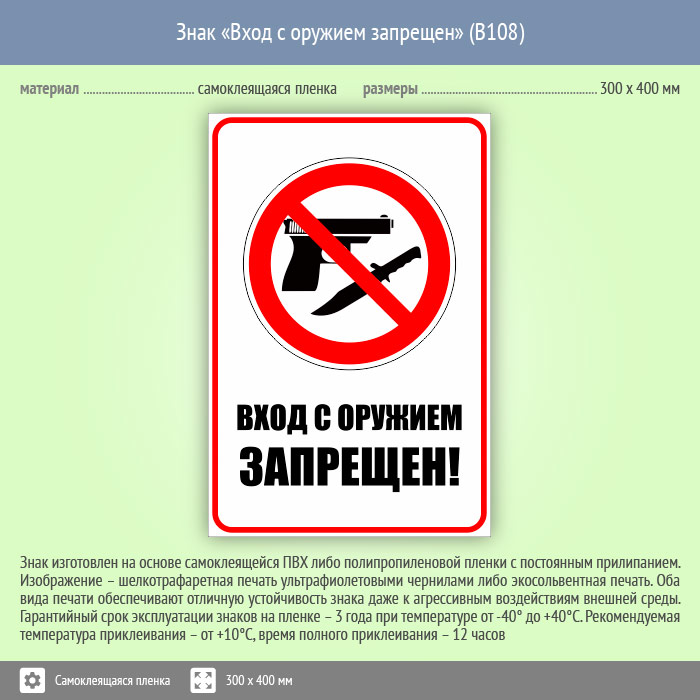 Знак «Вход с оружием запрещен», B108 (пленка, 300х400 мм) в Курске купить