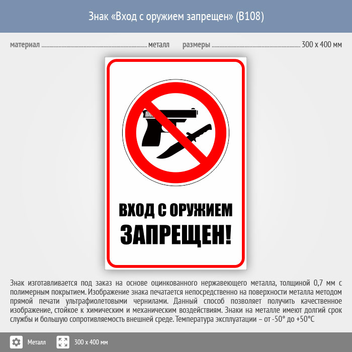 Знак «Вход с оружием запрещен», B108 (металл, 300х400 мм) в Курске купить