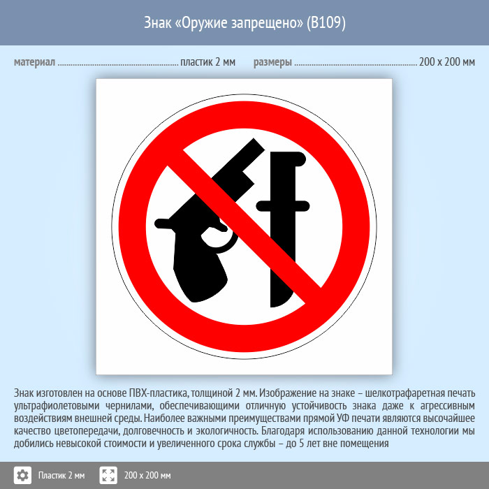 Знак «Оружие запрещено», B109 (пластик, 200х200 мм) в Курске купить