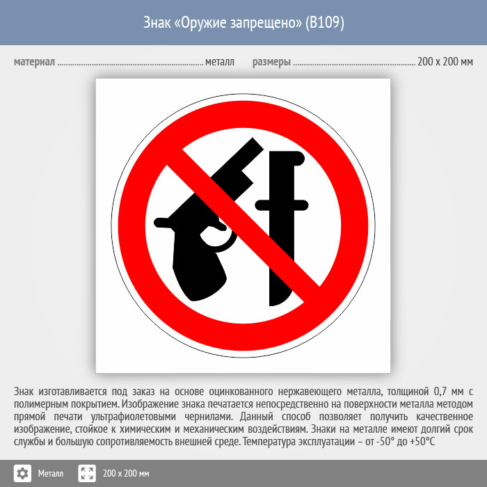 Знак «Оружие запрещено», B109 (металл, 200х200 мм) в Курске купить