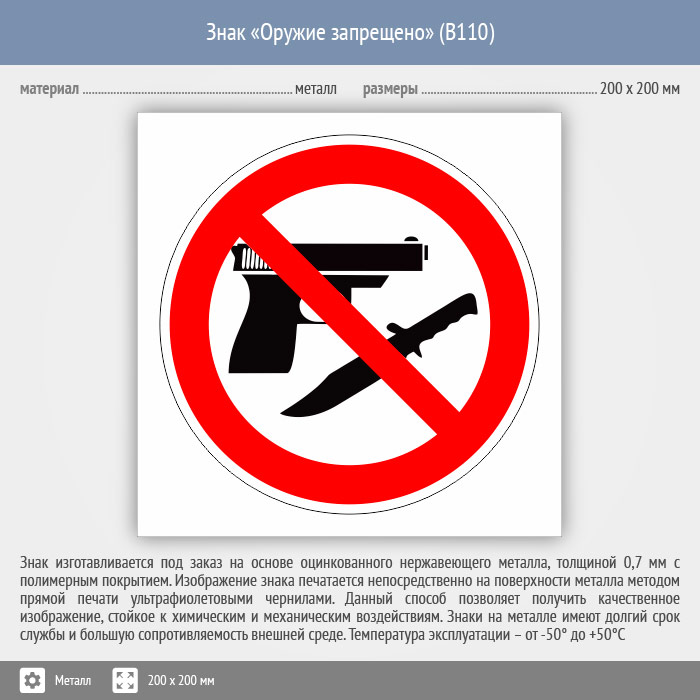 Знак «Оружие запрещено», B110 (металл, 200х200 мм) в Курске купить