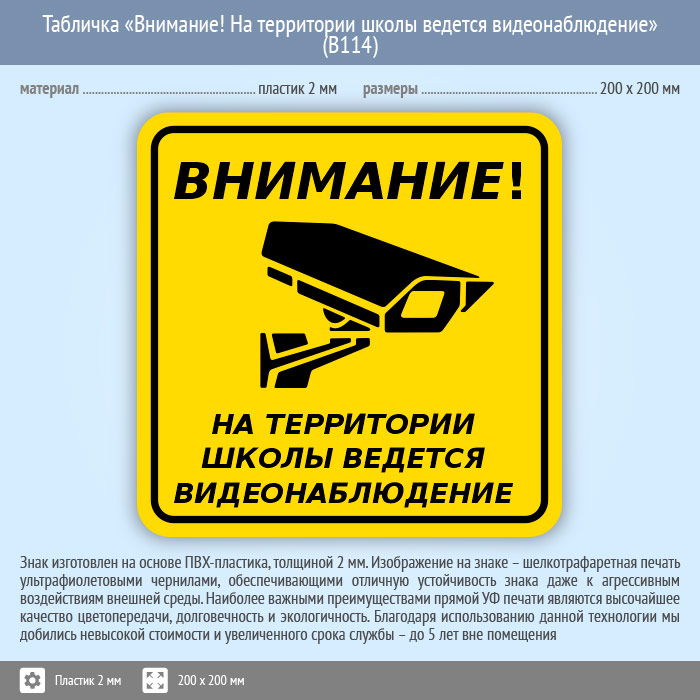 Табличка «Внимание! На территории школы ведется видеонаблюдение», B114 (пластик, 200х200 мм) в Курске купить