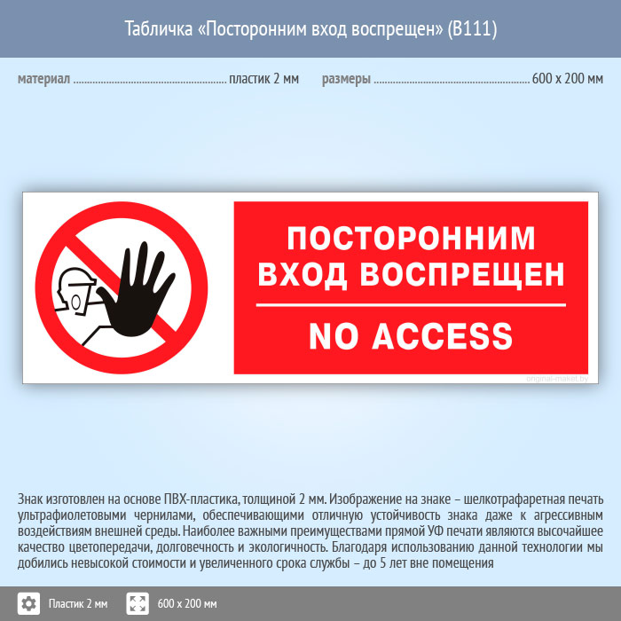 Табличка «Посторонним вход воспрещен», B111 (пластик, 600х200 мм) в Курске купить