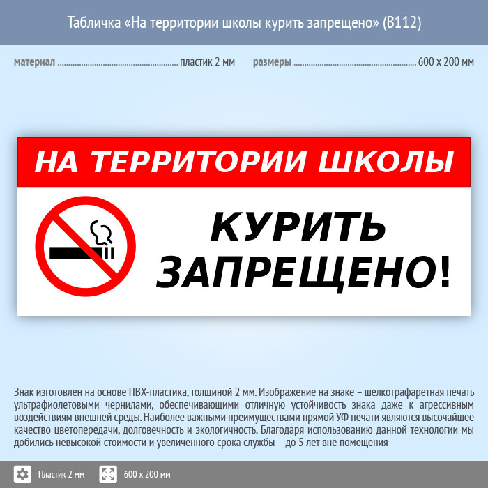 Табличка «На территории школы курить запрещено», B112 (пластик, 600х200 мм) в Курске купить