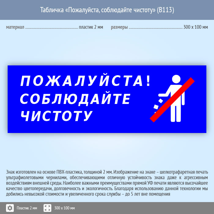 Табличка «Пожалуйста, соблюдайте чистоту», B113 (пластик, 300х100 мм) в Курске купить