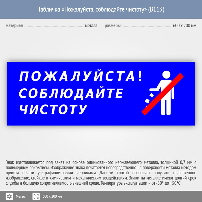 Табличка «Пожалуйста, соблюдайте чистоту», B113 (металл, 600х200 мм) в Курске купить