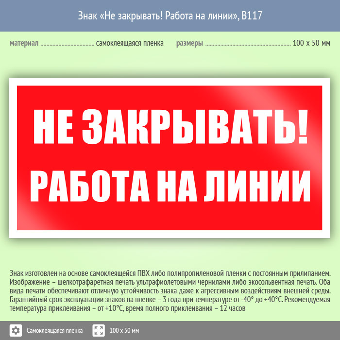 Знак «Не закрывать! Работа на линии», B117 (пленка, 100х50 мм) в Курске купить