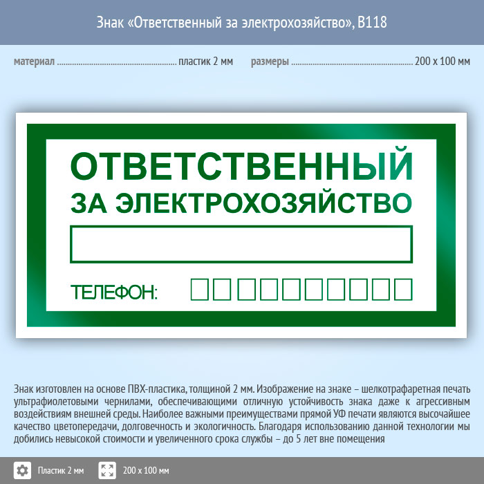 Знак «Ответственный за электрохозяйство», B118 (пластик, 200х100 мм) в Курске купить