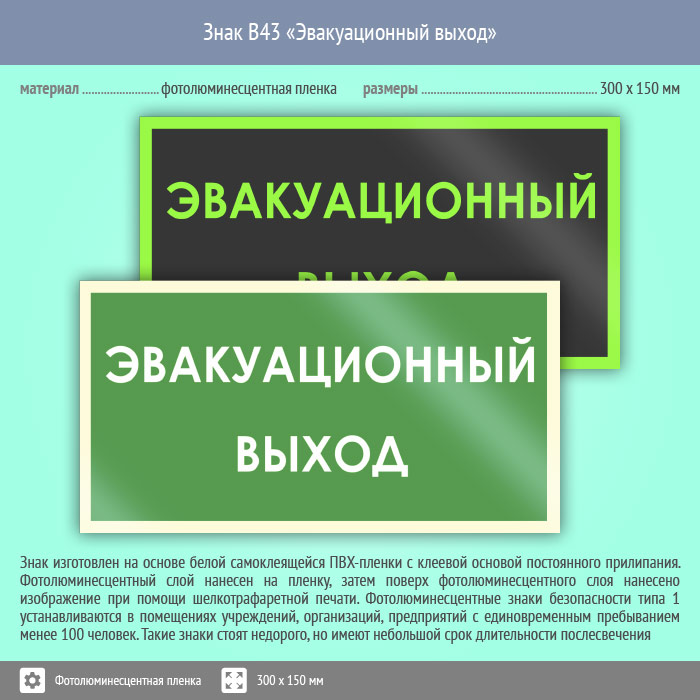 Знак B43 «Эвакуационный выход» (фотолюминесцентная пленка, 300х150 мм) в Курске купить