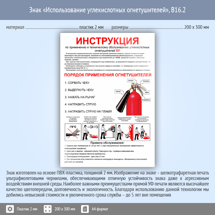 Знак «Использование углекислотных огнетушителей», B16.2 (пластик, 200х300 мм) в Курске купить
