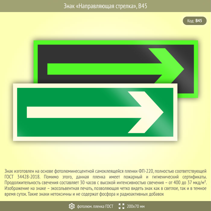Знак «Направляющая стрелка», B45 (фотолюминесцентная пленка ГОСТ 34428-2018, 200х70 мм) в Курске купить