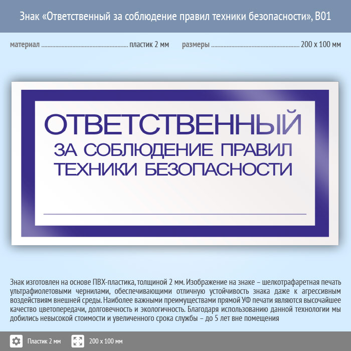 Знак «Ответственный за соблюдение правил техники безопасности», B01 (пластик, 200х100 мм) в Курске купить