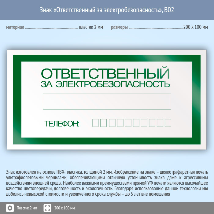 Знак «Ответственный за электробезопасность», B02 (пластик, 200х100 мм) в Курске купить