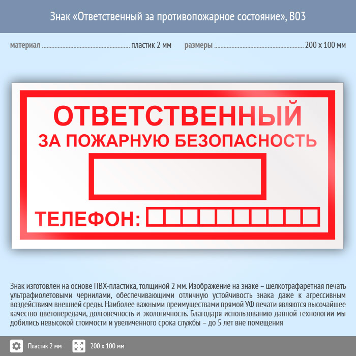 Знак «Ответственный за пожарную безопасность», B03 (пластик, 200х100 мм) в Курске купить