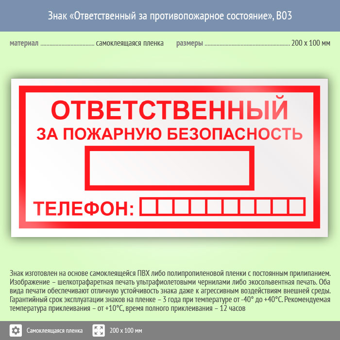 Знак «Ответственный за пожарную безопасность», B03 (пленка, 200х100 мм) в Курске купить