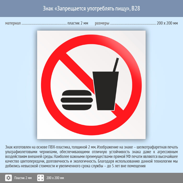 Знак «Запрещается употреблять пищу», B28 (пластик, 200х200 мм) в Курске купить