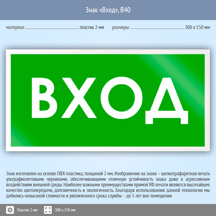 Знак «Вход», B40 (пластик, 300х150 мм) в Курске купить