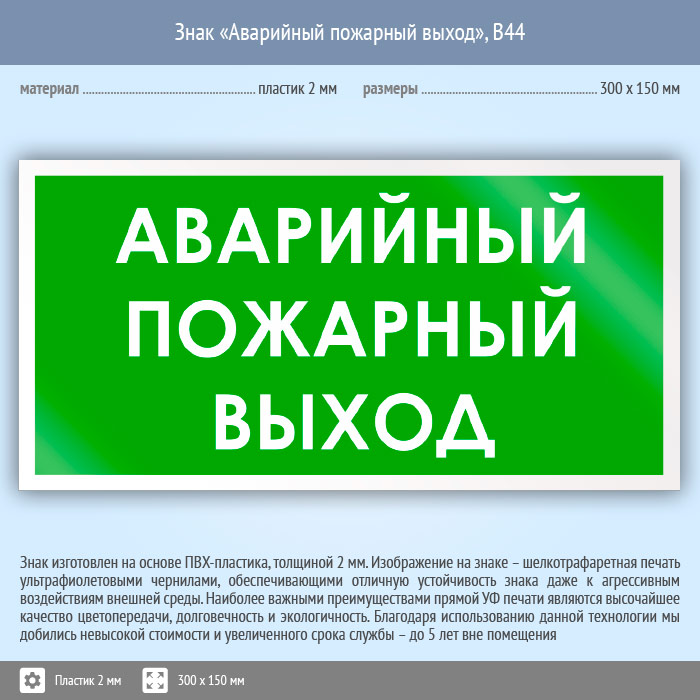 Знак «Аварийный пожарный выход», B44 (пластик, 300х150 мм) в Курске купить
