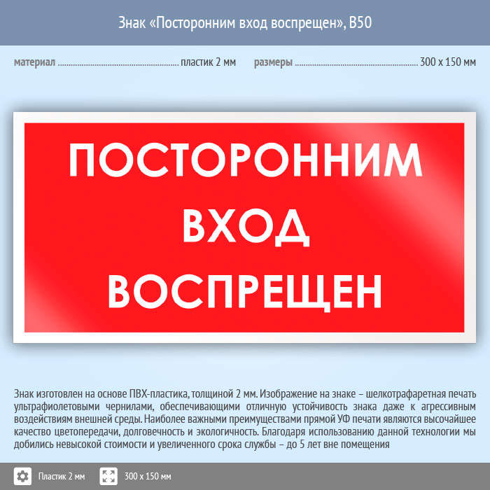 Знак «Посторонним вход воспрещен», B50 (пластик, 300х150 мм) в Курске купить