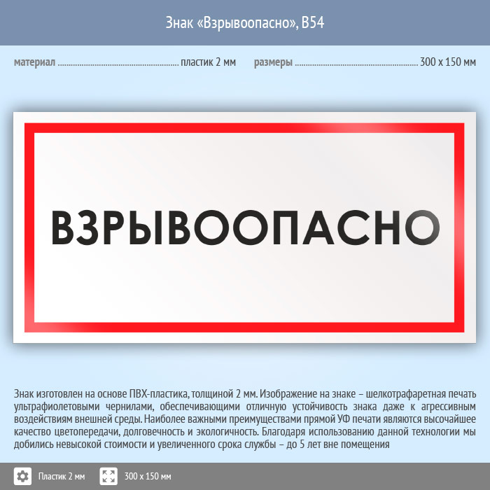 Знак «Взрывоопасно», B54 (пластик, 300х150 мм) в Курске купить