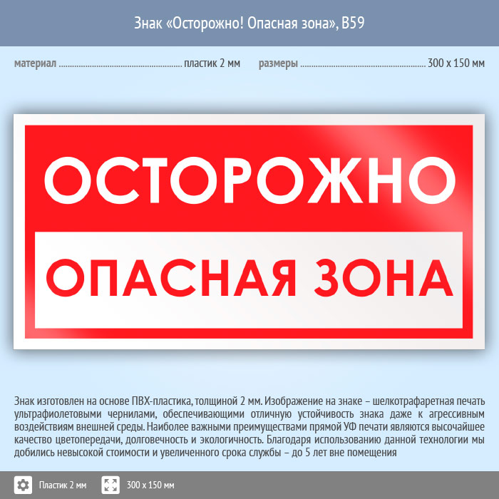 Знак «Осторожно! Опасная зона», B59 (пластик, 300х150 мм) в Курске купить