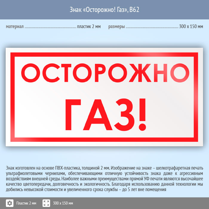 Знак «Осторожно! Газ», B62 (пластик, 300х150 мм) в Курске купить