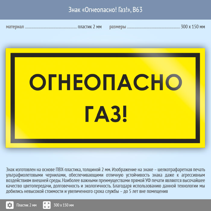 Знак «Огнеопасно! Газ!», B63 (пластик, 300х150 мм) в Курске купить