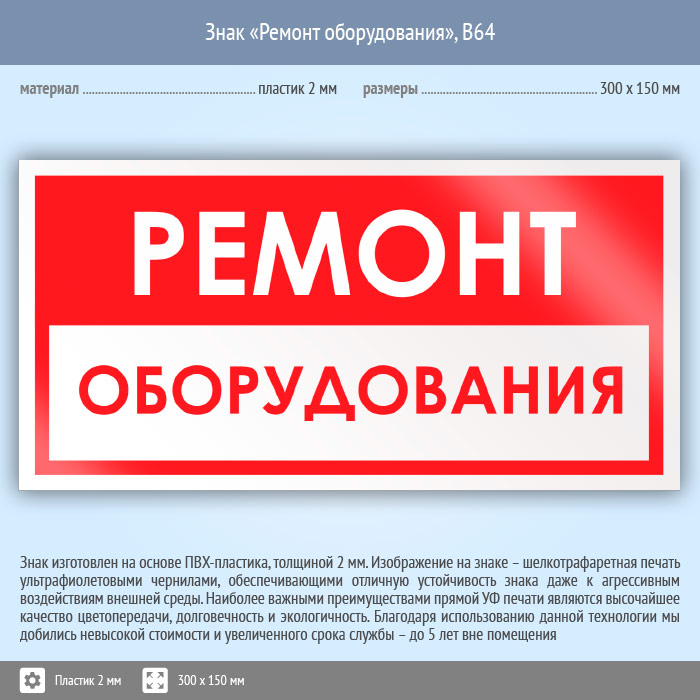Знак «Ремонт оборудования», B64 (пластик, 300х150 мм) в Курске купить