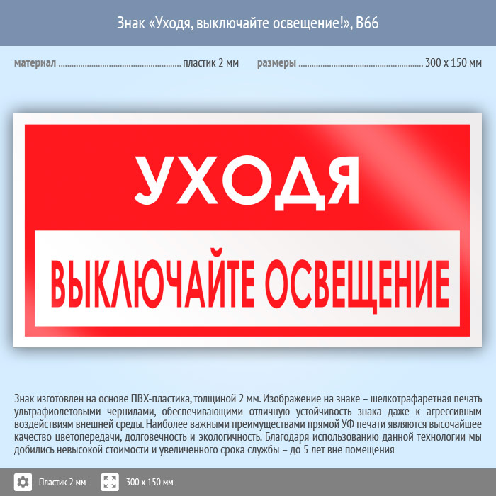 Знак «Уходя, выключайте освещение!», B66 (пластик, 300х150 мм) в Курске купить