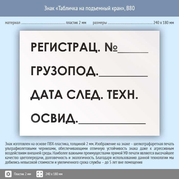 Знак «Табличка на подъемный кран», B80 (пластик, 240х180 мм) в Курске купить