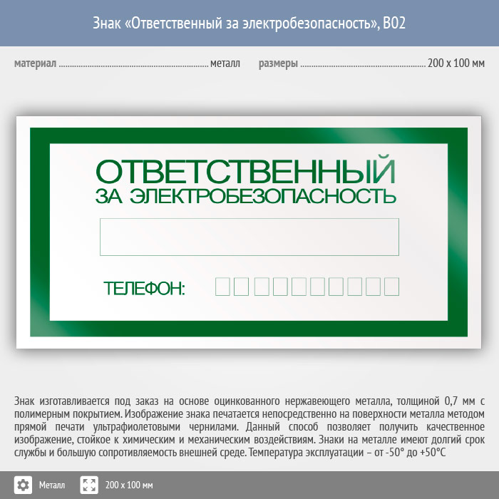 Знак «Ответственный за электробезопасность», B02 (металл, 200х100 мм) в Курске купить