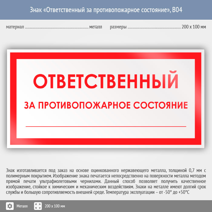 Знак «Ответственный за противопожарное состояние», B04 (металл, 200х100 мм) в Курске купить