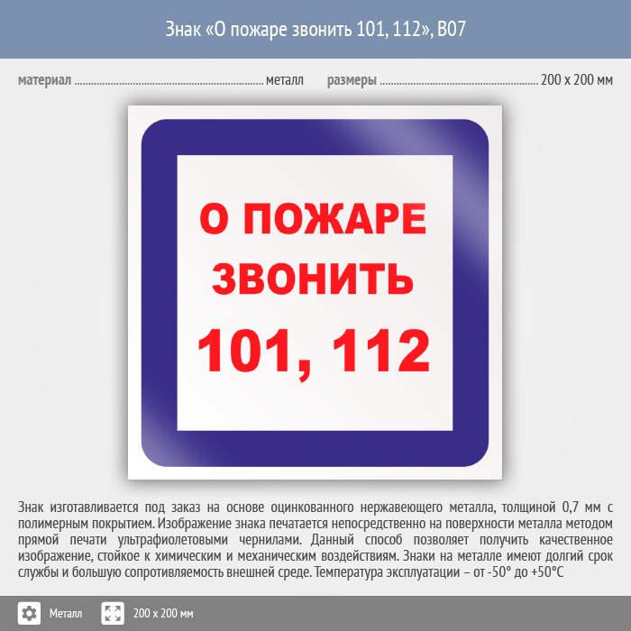 Знак «О пожаре звонить 101, 112», B07 (металл, 200х200 мм) в Курске купить