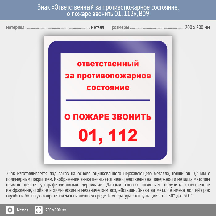 Знак «Ответственный за противопожарное состояние, о пожаре звонить 01, 112», B09 (металл, 200х200 мм) в Курске купить