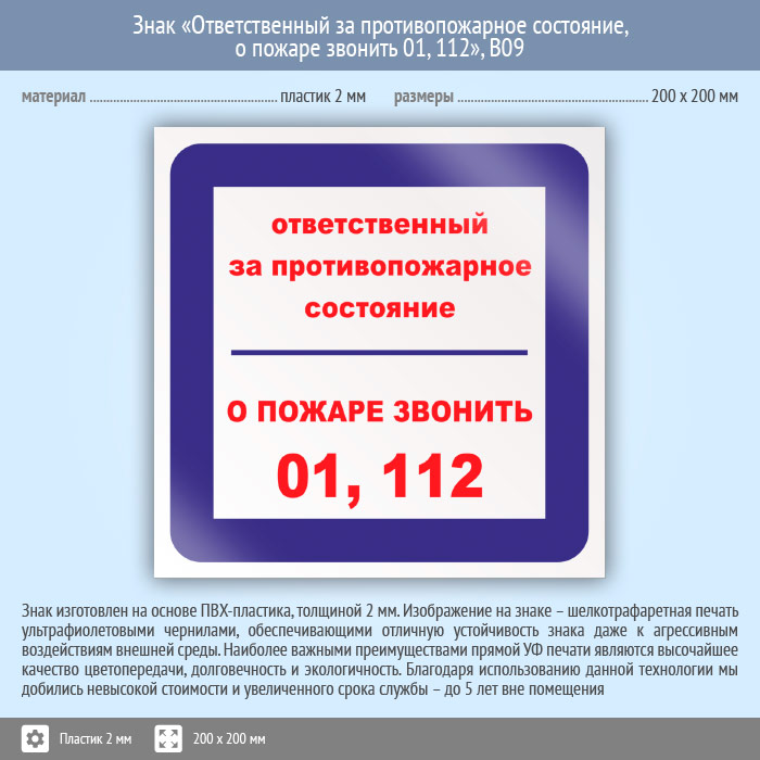 Знак «Ответственный за противопожарное состояние, о пожаре звонить 01, 112», B09 (пластик, 200х200 мм) в Курске купить