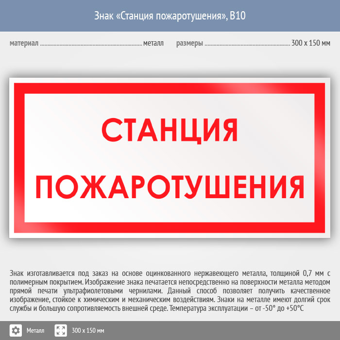 Знак «Станция пожаротушения», B10 (металл, 300х150 мм) в Курске купить