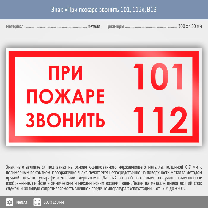 Знак «При пожаре звонить 101, 112», B13 (металл, 300х150 мм) в Курске купить