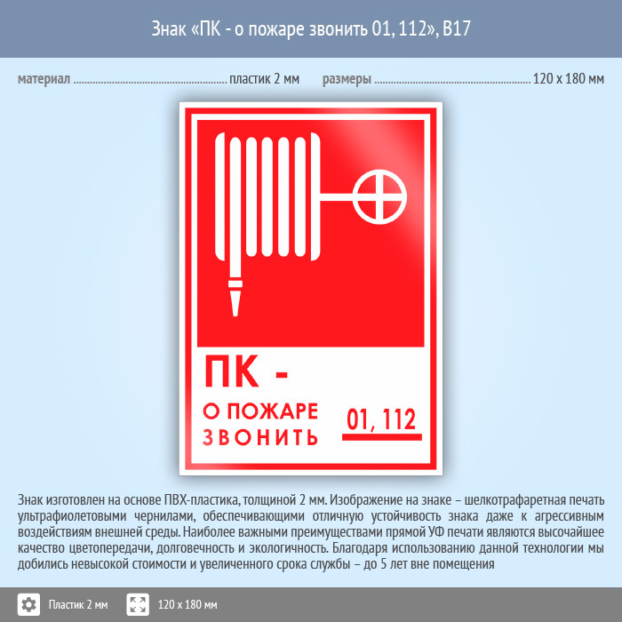 Знак «ПК - о пожаре звонить 01, 112», B17 (пластик, 120х180 мм) в Курске купить
