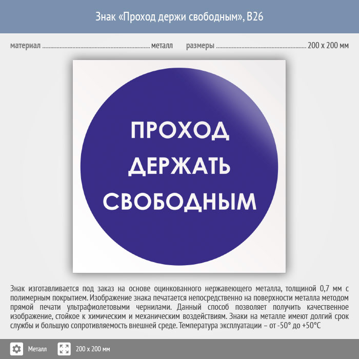 Знак «Проход держи свободным», B26 (металл, 200х200 мм) в Курске купить
