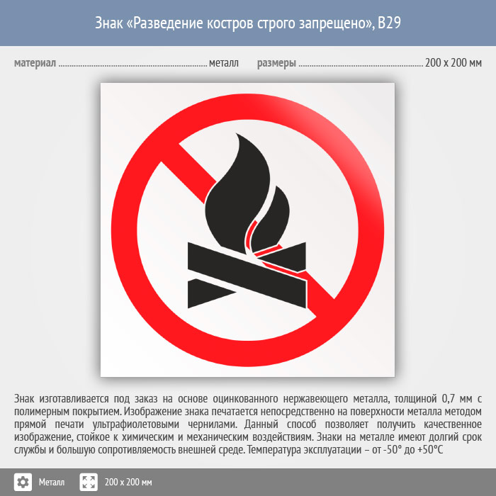 Знак «Разведение костров строго запрещено», B29 (металл, 200х200 мм) в Курске купить