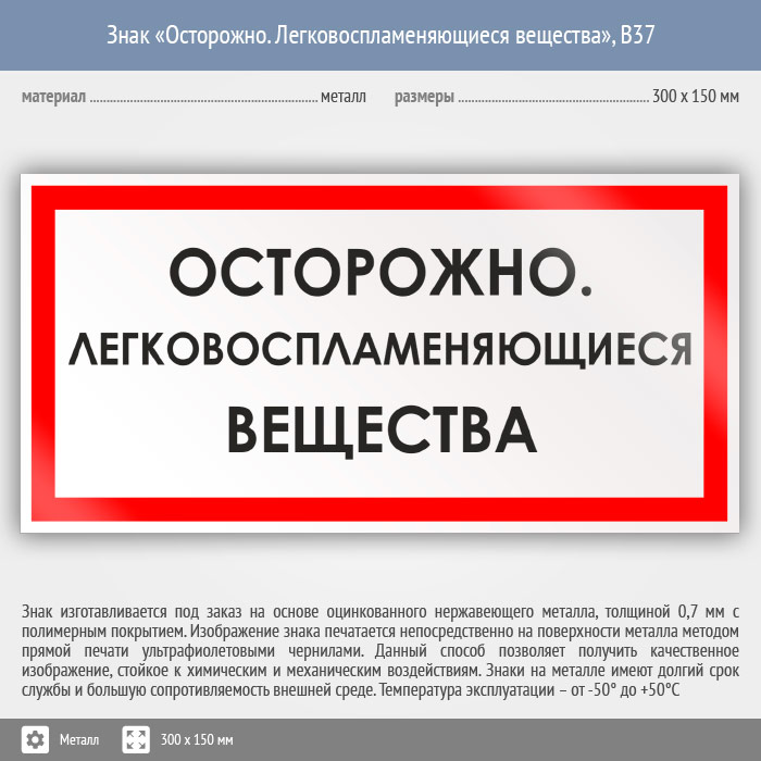 Знак «Осторожно. Легковоспламеняющиеся вещества», B37 (металл, 300х150 мм) в Курске купить