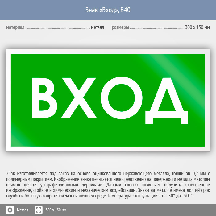 Знак «Вход», B40 (металл, 300х150 мм) в Курске купить
