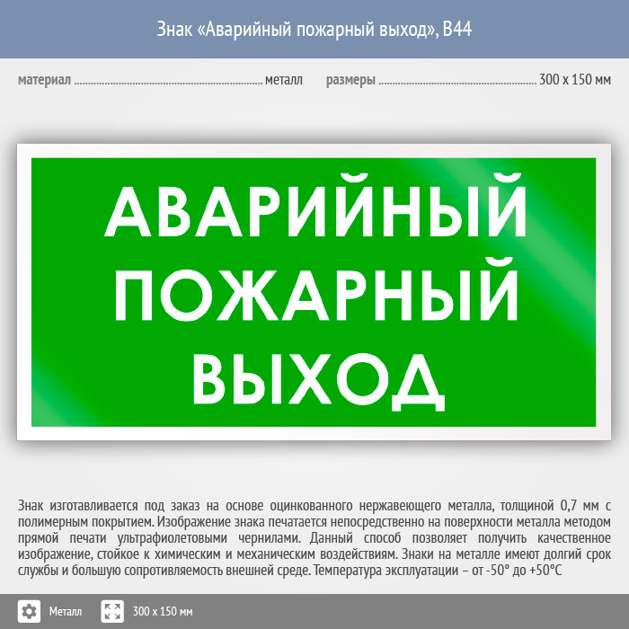 Знак «Аварийный пожарный выход», B44 (металл, 300х150 мм) в Курске купить