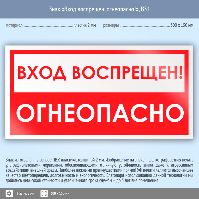 Знак «Вход воспрещен, огнеопасно!», B51 (пластик, 300х150 мм) в Курске купить