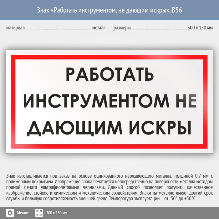 Знак «Работать инструментом, не дающим искры», B56 (металл, 300х150 мм) в Курске купить