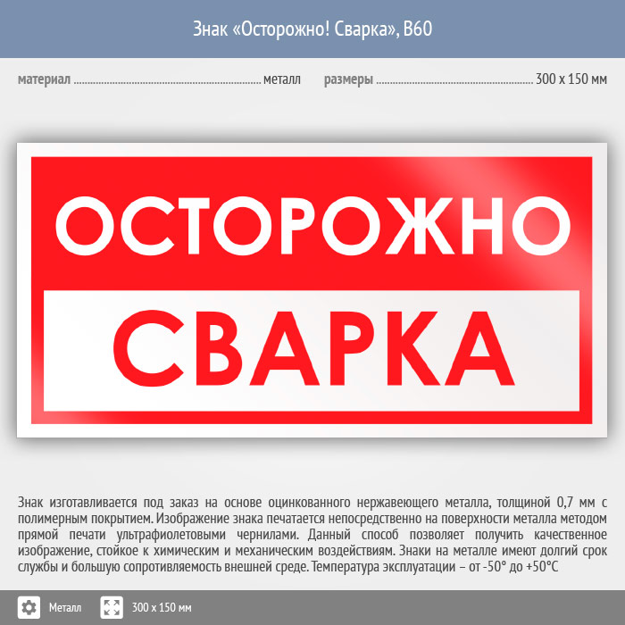 Знак «Осторожно! Сварка», B60 (металл, 300х150 мм) в Курске купить