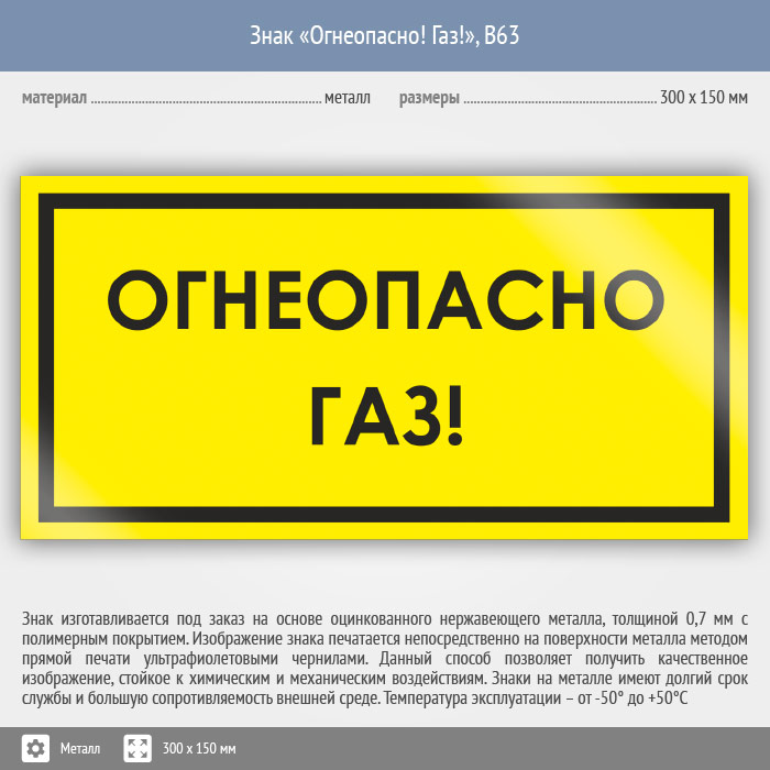 Знак «Огнеопасно! Газ!», B63 (металл, 300х150 мм) в Курске купить