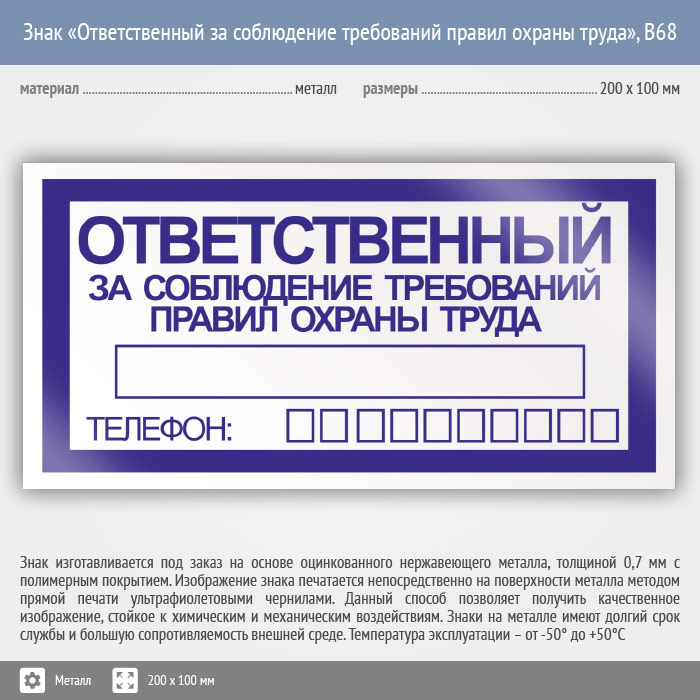 Знак «Ответственный за соблюдение требований правил охраны труда», B68 (металл, 200х100 мм) в Курске купить